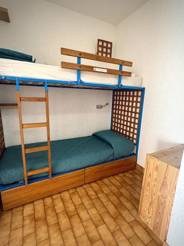 Chambre avec lit double, cabine avec 2 lits superposés, et séjour avec canapé-lit gigogne à tiroir.