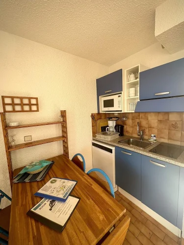 Kitchenette équipée : lave-vaisselle, micro-ondes, réfrigérateur-congélateur, grille-pain, cafetière filtre.