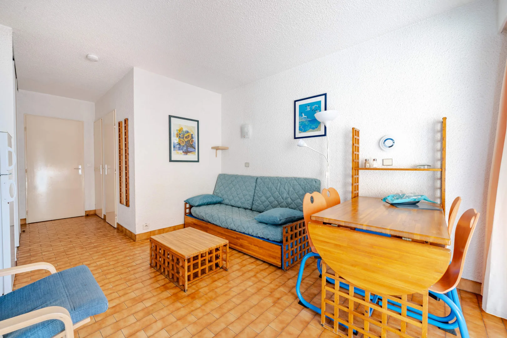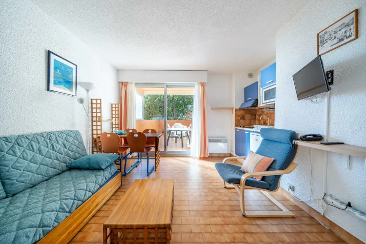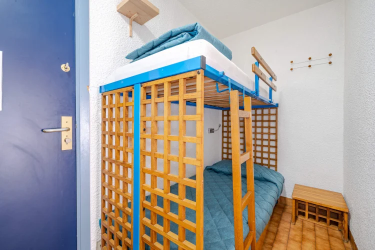 Séjour avec canapé-lit gigogne à tiroir (2 personnes) et lits superposés (2 personnes).