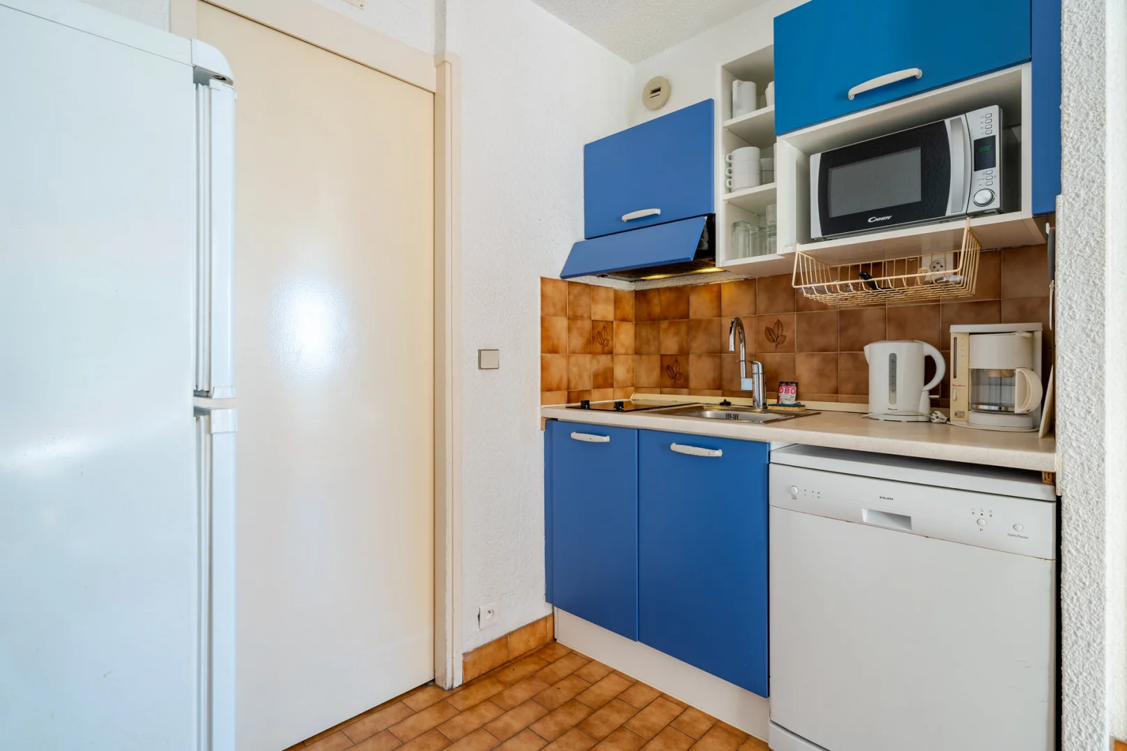 Kitchenette équipée : lave-vaisselle, micro-ondes, réfrigérateur-congélateur, grille-pain, cafetière filtre.