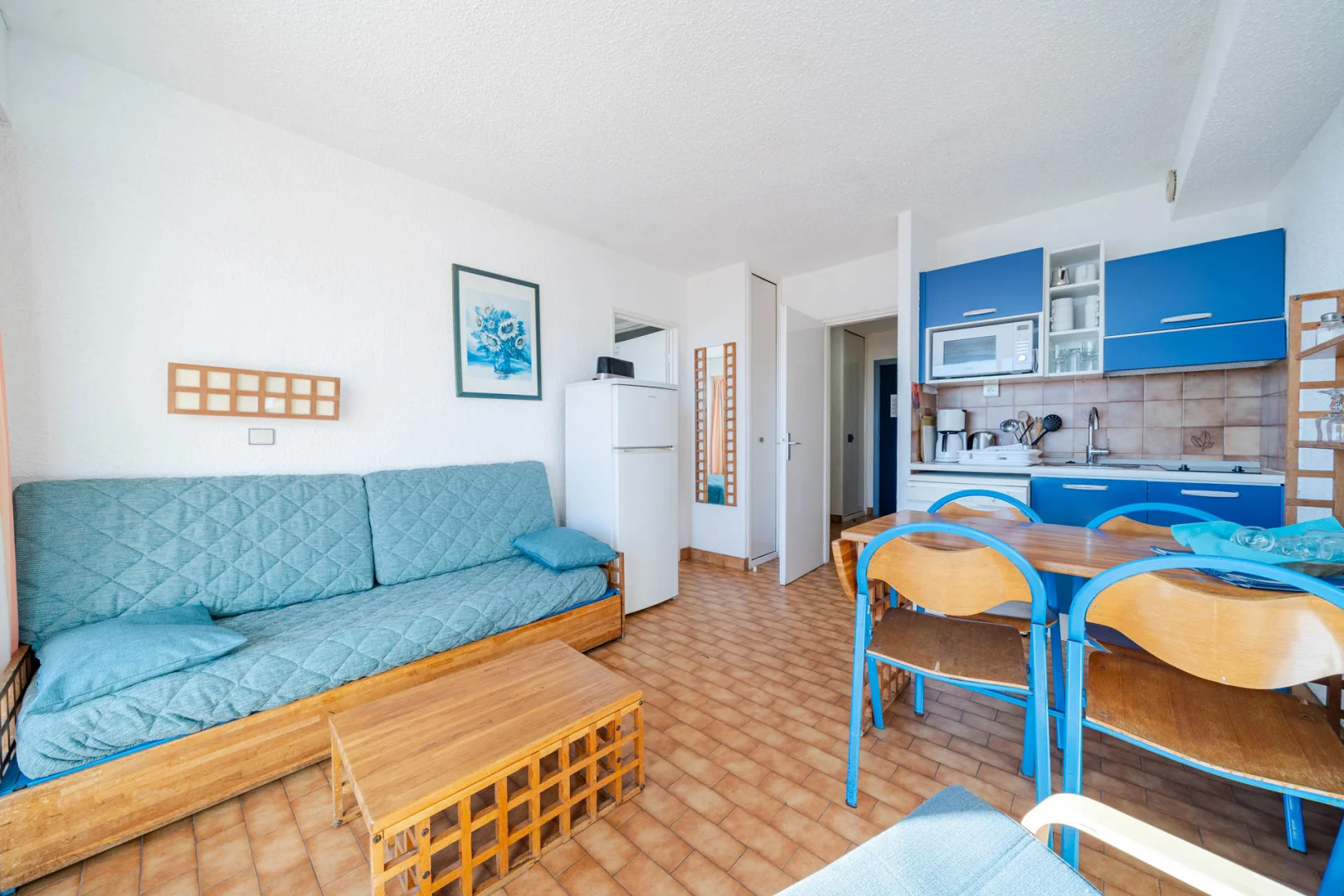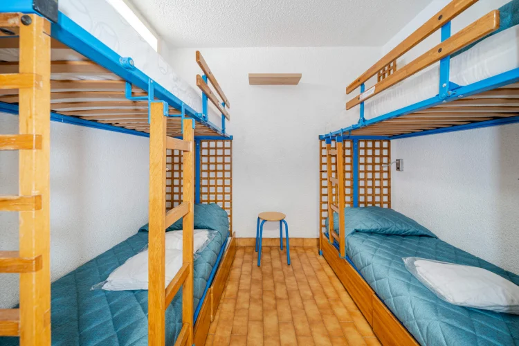 Chambre avec lit double, 2 x 2 lits superposés, et séjour avec canapé-lit gigogne à tiroir.