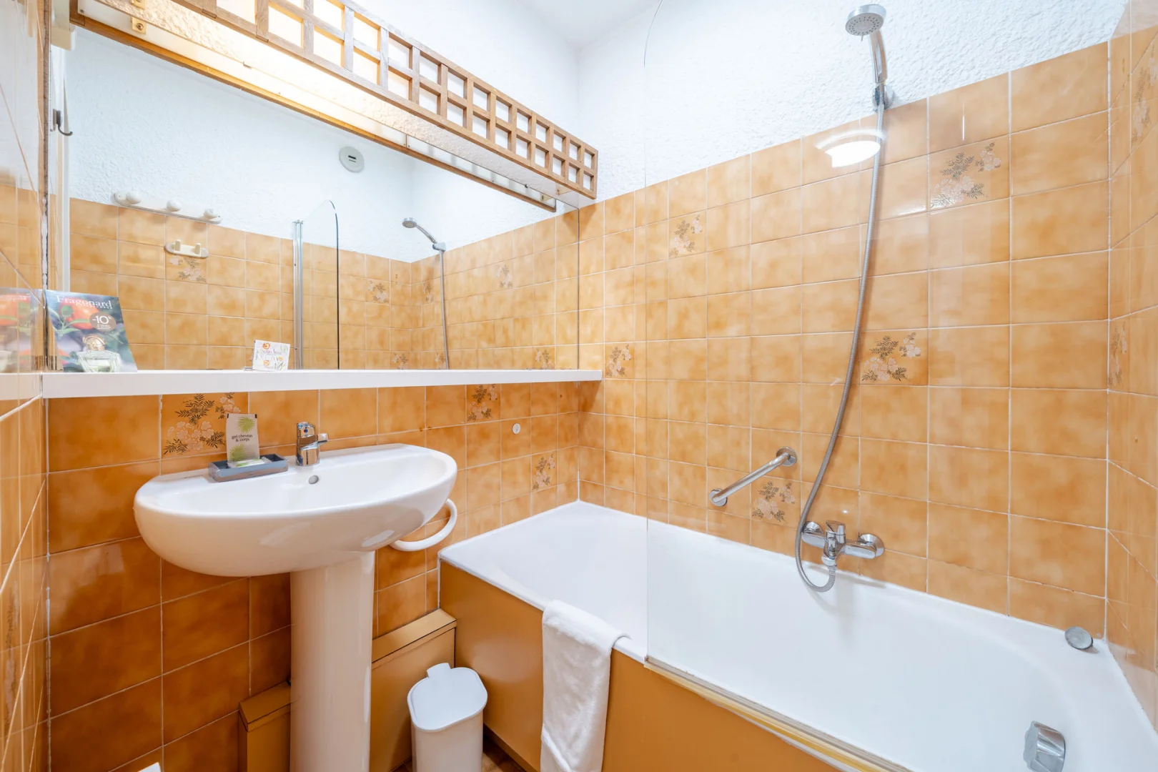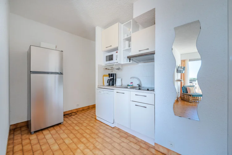 Kitchenette équipée : lave-vaisselle, micro-ondes, réfrigérateur-congélateur, grille-pain, cafetière filtre.