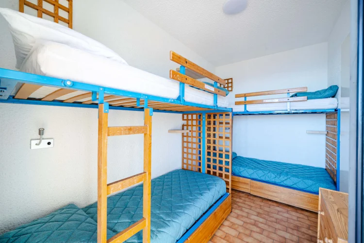 Chambre avec lit double, 2 x 2 lits superposés, et séjour avec canapé-lit gigogne à tiroir.
