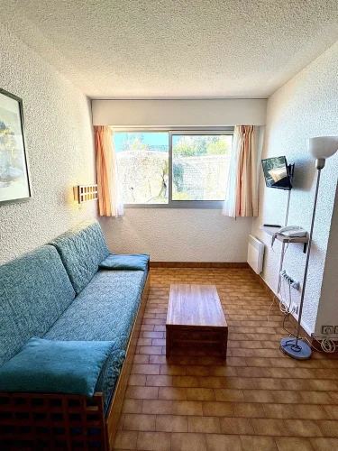 Séjour avec canapé-lit gigogne à tiroir (2 personnes) et lits superposés (2 personnes).