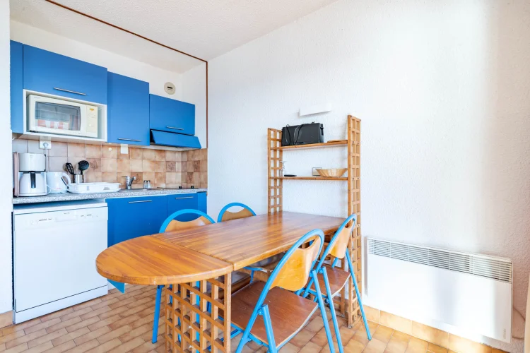 Kitchenette équipée : lave-vaisselle, micro-ondes, réfrigérateur-congélateur, grille-pain, cafetière filtre.