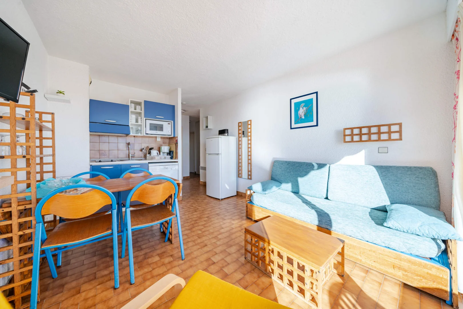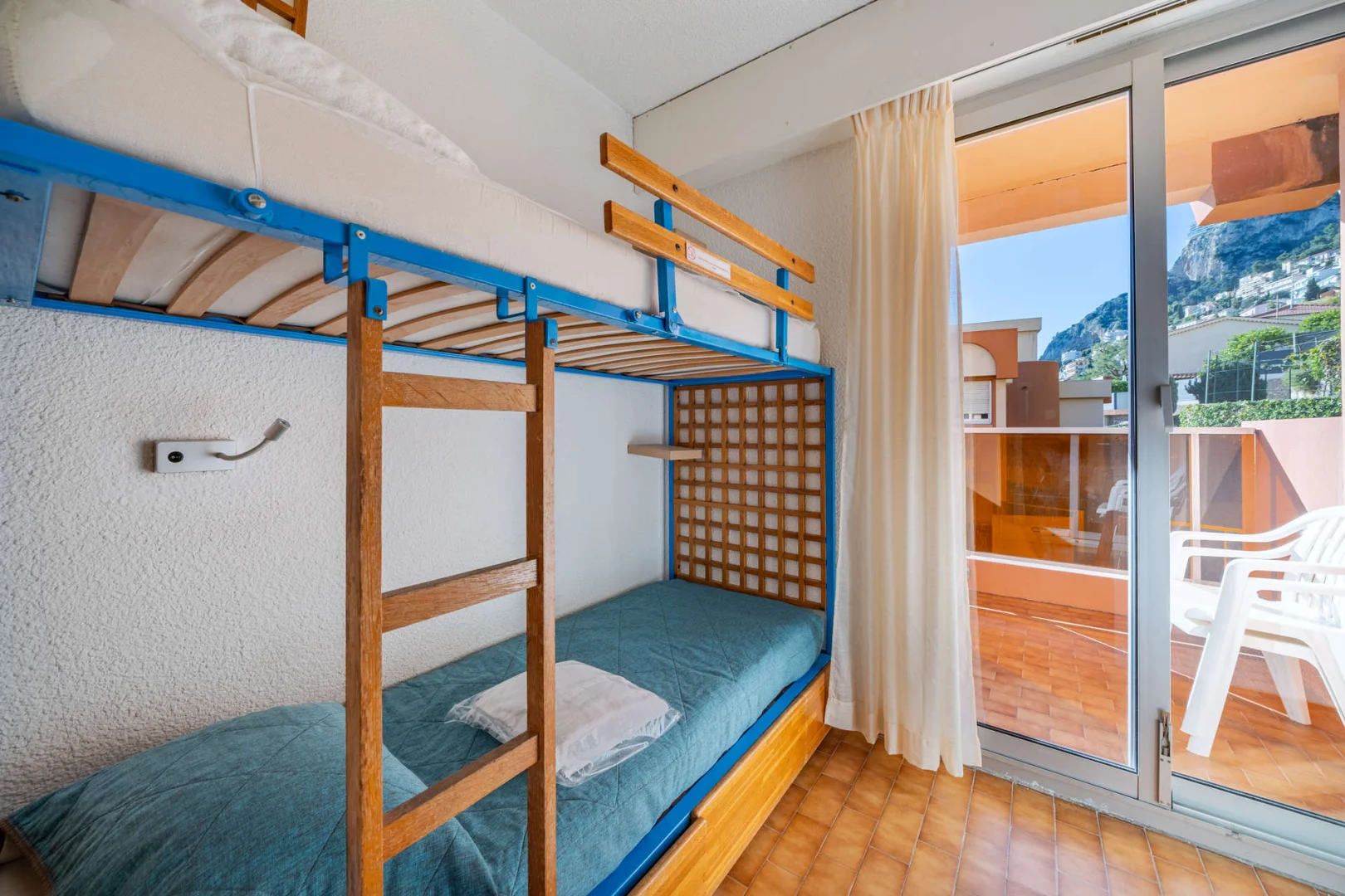 Chambre avec lit double, 2 lits superposés, et séjour avec canapé-lit gigogne à tiroir.
