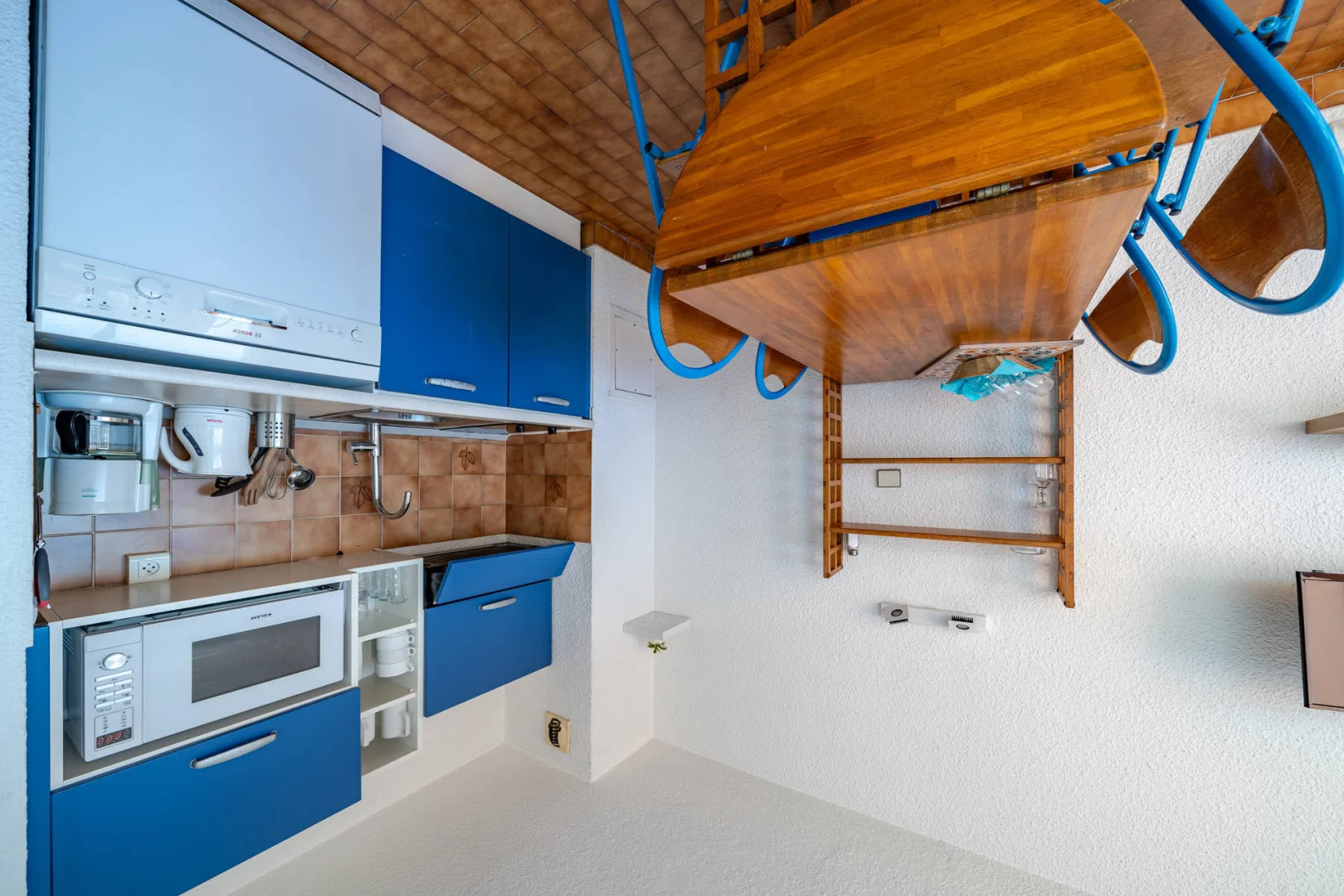 Kitchenette équipée : lave-vaisselle, micro-ondes, réfrigérateur-congélateur, grille-pain, cafetière-filtre.