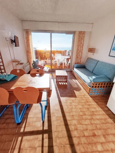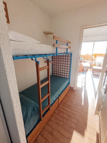 Séjour avec canapé-lit gigogne à tiroir (2 pers.) et lits superposés (2 pers.).
