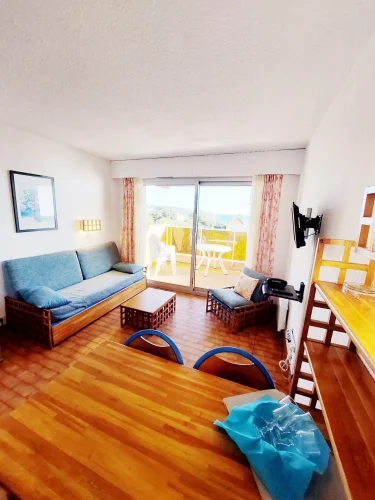 Séjour avec canapé-lit gigogne à tiroir (2 pers.) et lits superposés (2 pers.).