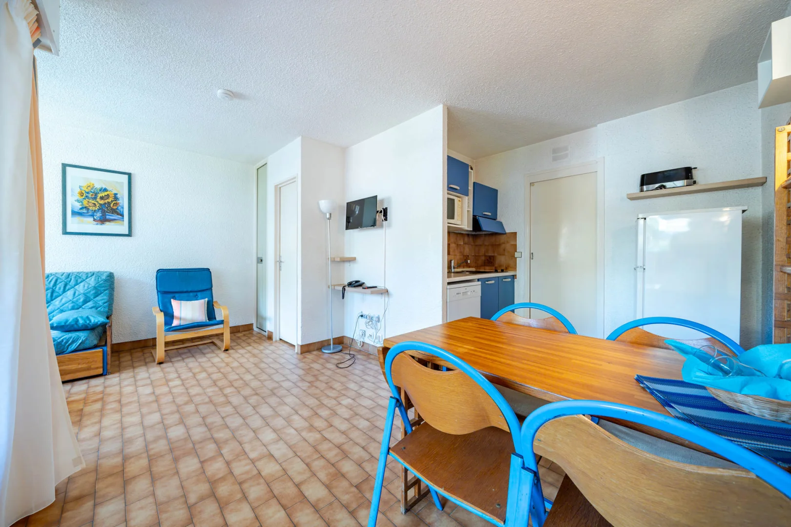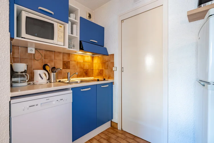 Kitchenette équipée : lave-vaisselle, micro-ondes, réfrigérateur-congélateur, grille-pain, cafetière filtre.