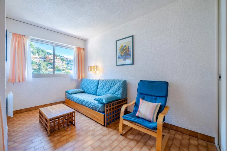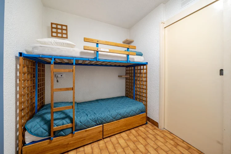Séjour avec canapé-lit gigogne à tiroir (2 personnes) et lits superposés (2 personnes).