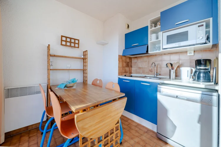Kitchenette équipée : lave-vaisselle, micro-ondes, réfrigérateur-congélateur, grille-pain, cafetière-filtre.
