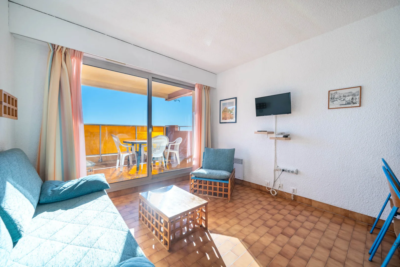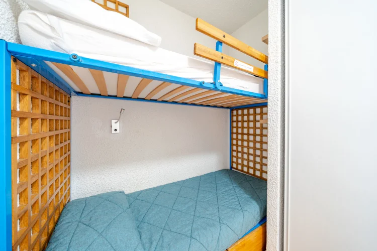 Séjour avec canapé-lit gigogne à tiroir (2 pers.) et lits superposés (2 pers.).