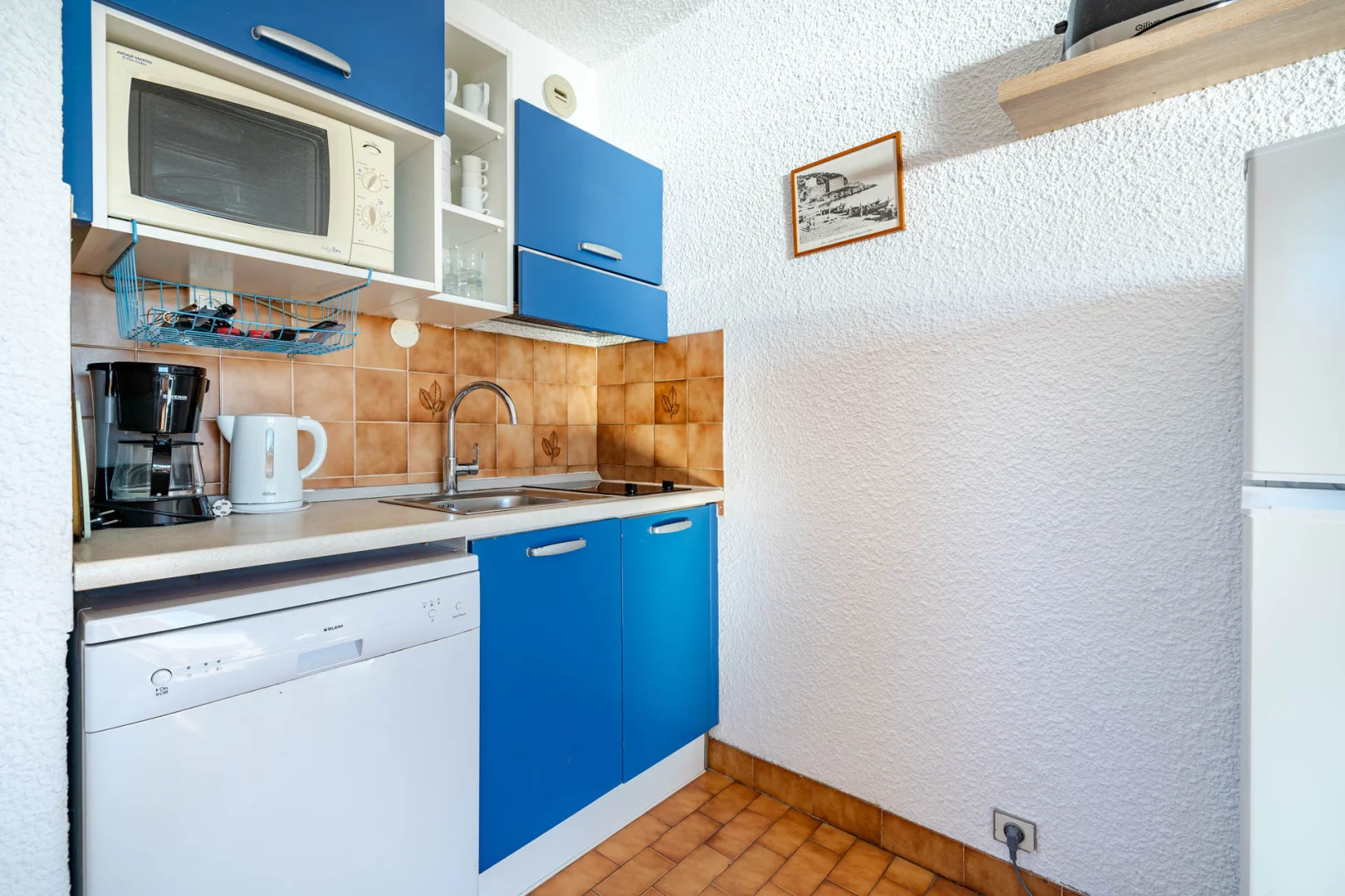 Kitchenette équipée : lave-vaisselle, micro-ondes, réfrigérateur-congélateur, grille-pain, cafetière-filtre.