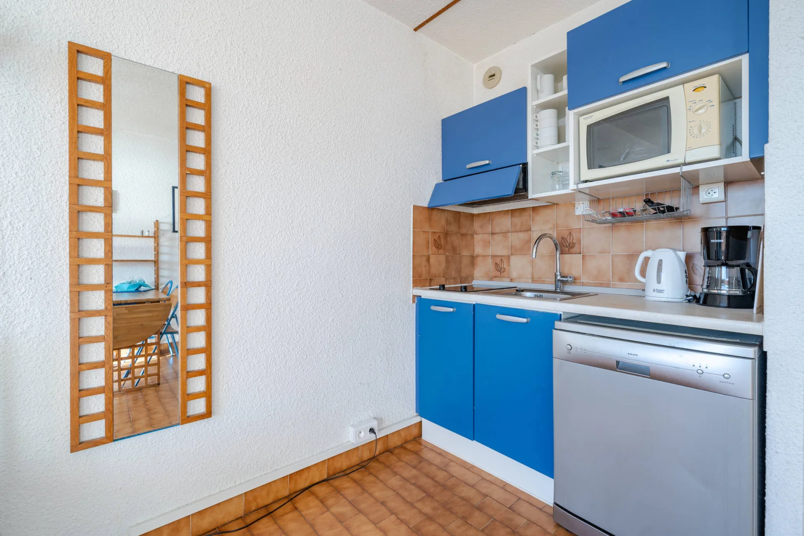 Kitchenette équipée : lave-vaisselle, micro-ondes, réfrigérateur-congélateur, grille-pain, cafetière-filtre.