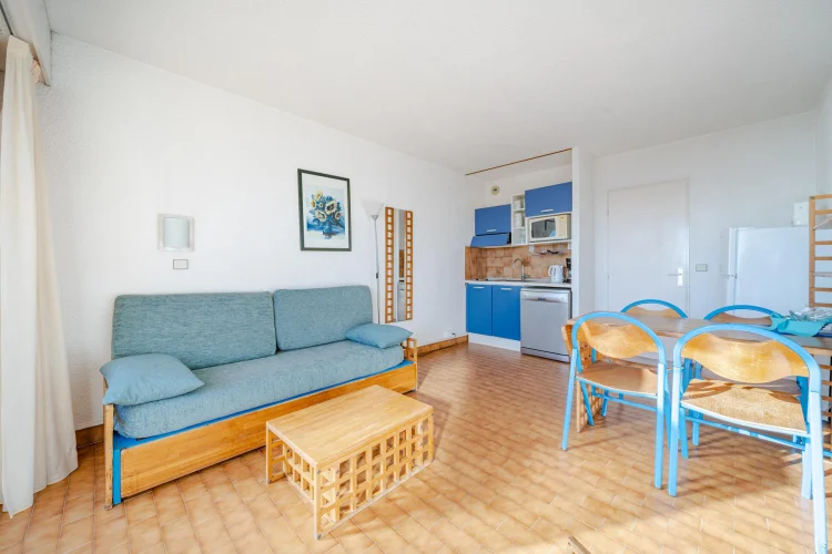 Séjour avec canapé-lit gigogne à tiroir (2 pers.) et lits superposés (2 pers.).