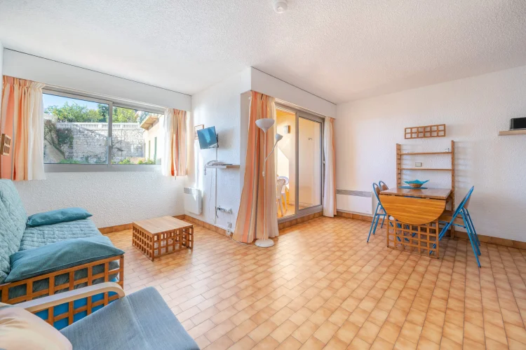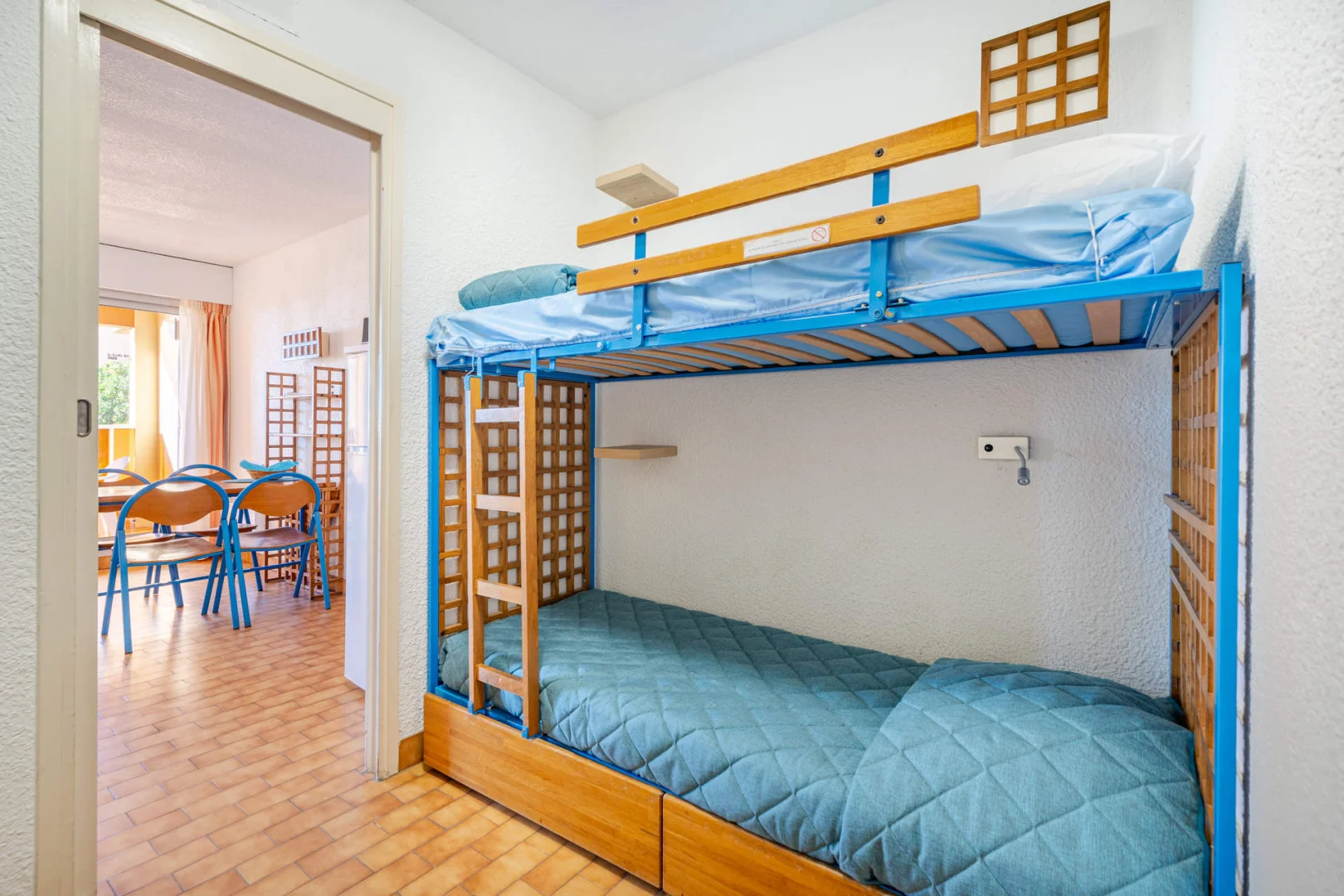 Séjour avec canapé-lit gigogne à tiroir (2 personnes) et lits superposés (2 personnes).