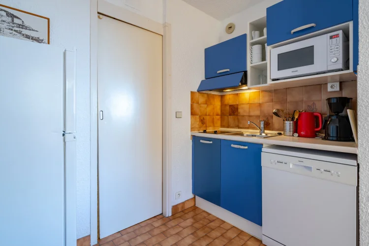 Kitchenette équipée : lave-vaisselle, micro-ondes, réfrigérateur-congélateur, grille-pain, cafetière filtre.